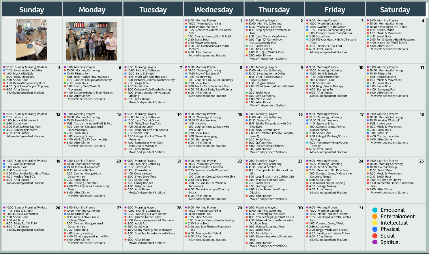 Our specialized program calendar is thoughtfully crafted to cater to the unique needs of individuals facing memory challenges. Engage in sensory-based activities that stimulate cognition and evoke positive memories. From music therapy sessions that resonate with the soul to reminiscence groups that foster connections, every element of our calendar is infused with empathy and understanding. Our dedicated team creates a warm and supportive environment, ensuring residents feel secure while participating in activities that promote mental, emotional, and physical well-being. Explore the monthly program calendar to discover a rich tapestry of moments specially crafted for our memory care community, offering a path to joy, connection, and meaningful experiences for each resident.